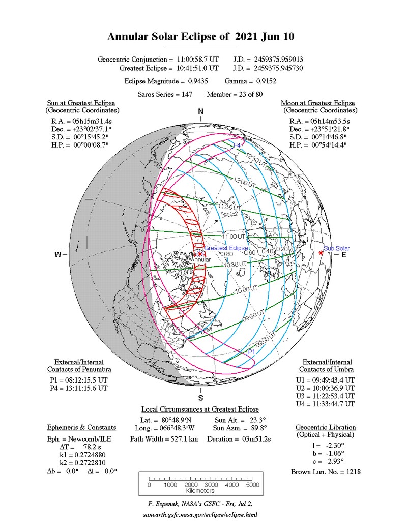 Comenzaba a las 09:49:43 UT, 10:00:36 UT, 11:22:53 UT, 11:33:44 UT Annular dur=03m51s , parcial en N. America, Europe, Asia [Annular: norte Canada, Groenlandia, Rusia]