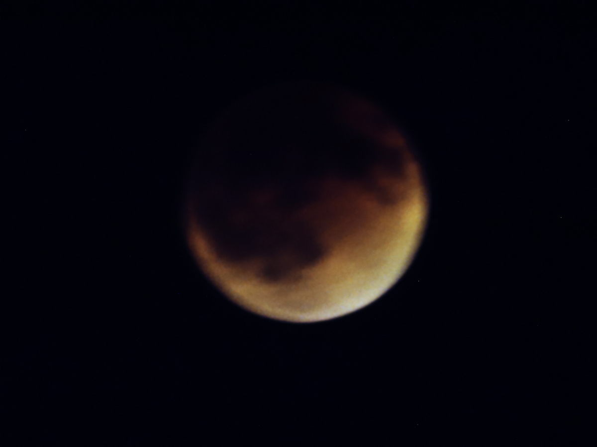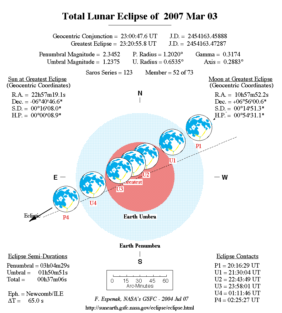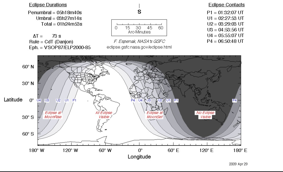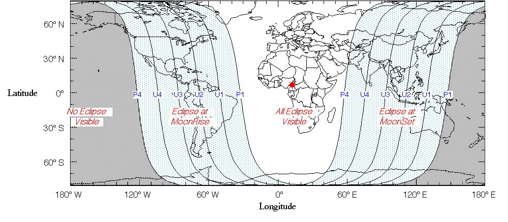 El máximo de la fase total es a las 04:12:42 UT con la Luna a unos 7º sobre el horizonte y ya en crepúsculo muy luminoso. Acaba a las 6:50:48 UT ya bajo el horizonte