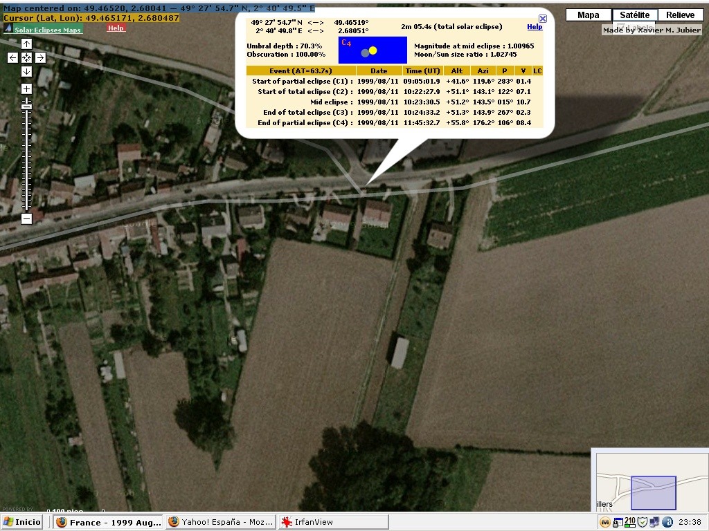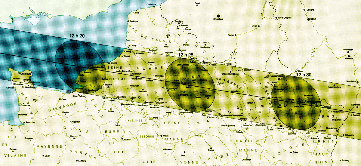Expedición al eclipse total de sol. 11 de agosto de 1999 Otro eclipse organizado por la Sociedad Astronómica para disfrutar del espectáculo de un eclipse total de sol, que les había puesto los dientes largos para contemplar el resto de socios de esta maravilla de la naturaleza. Partimos tres coches con expedicionarios para observar el último eclipse del siglo. Era verano y las vacaciones eran un problema menor. La espectación fue enorme, era un eclipse total de sol en el corazón de Europa, y la gente quería contenplarlo. Pero la naturaleza a veces es esquiva y el tiempo no se prestó para lo mejor. Además, el atasco que se produjo en la autopista fue de parada total. Tuvimos nuestro cuartel de guardia en la ciudad de Compiegne, famosa porque en el bosque comunal de Compiègne, en un vagón, en un claro próximo a Rethondes, se firmó el armisticio del 11 de noviembre de 1918, entre Francia y Alemania, en presencia del mariscal Foch y del general Weygand. También conocida porque Juana de Arco fue capturada al atravesar la orilla derecha del Oise, Compiégne era un lugar de paso por el Oise. Los claros que nos dejaron las nubes, obtuvimos solamente estas imágenes: |